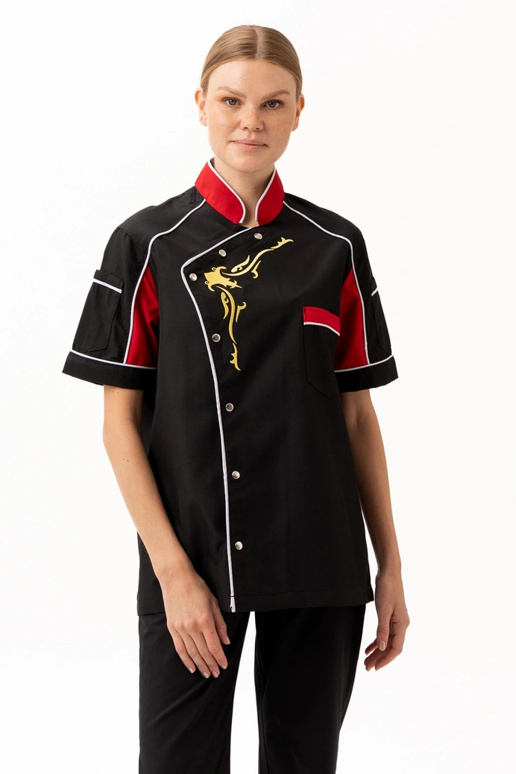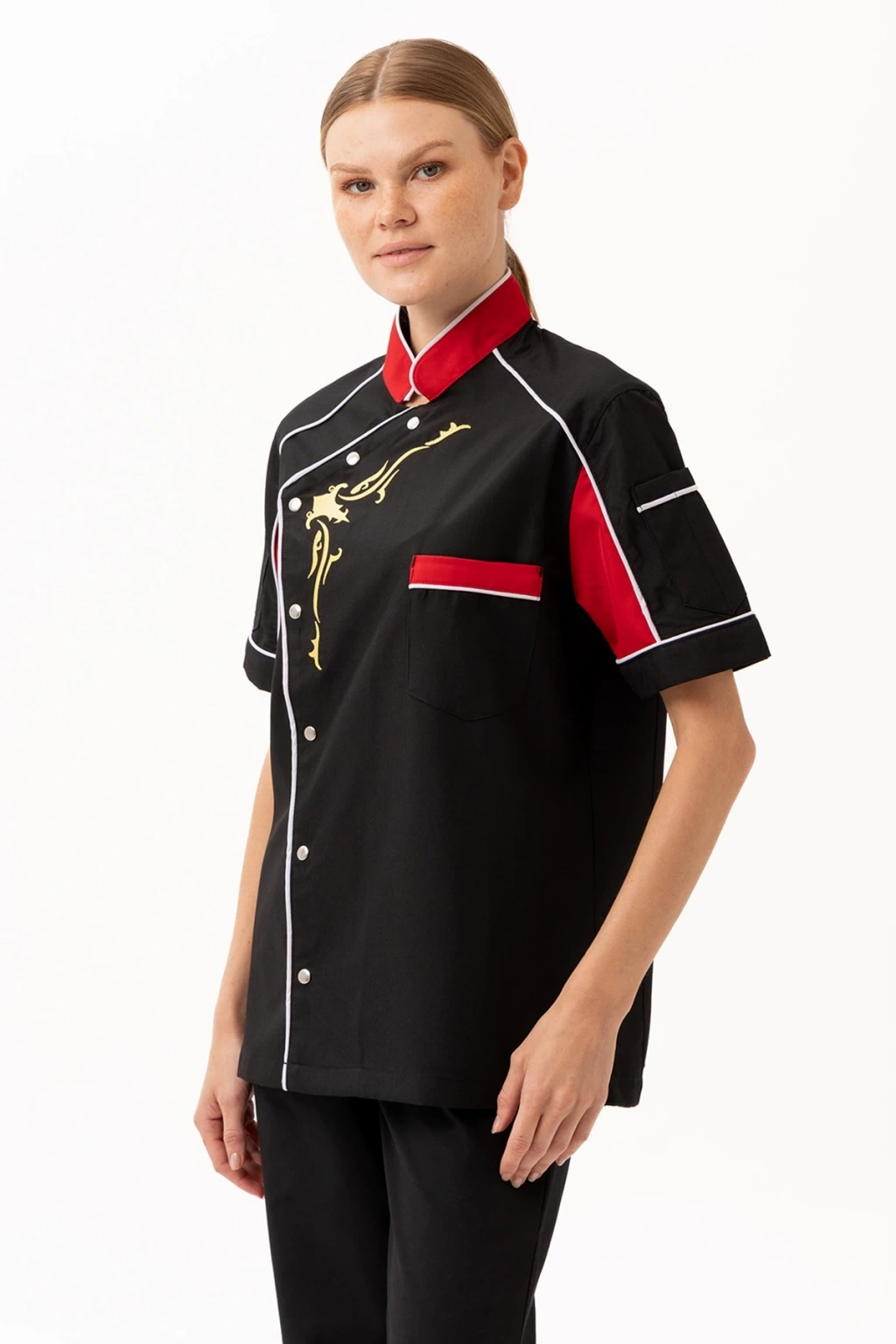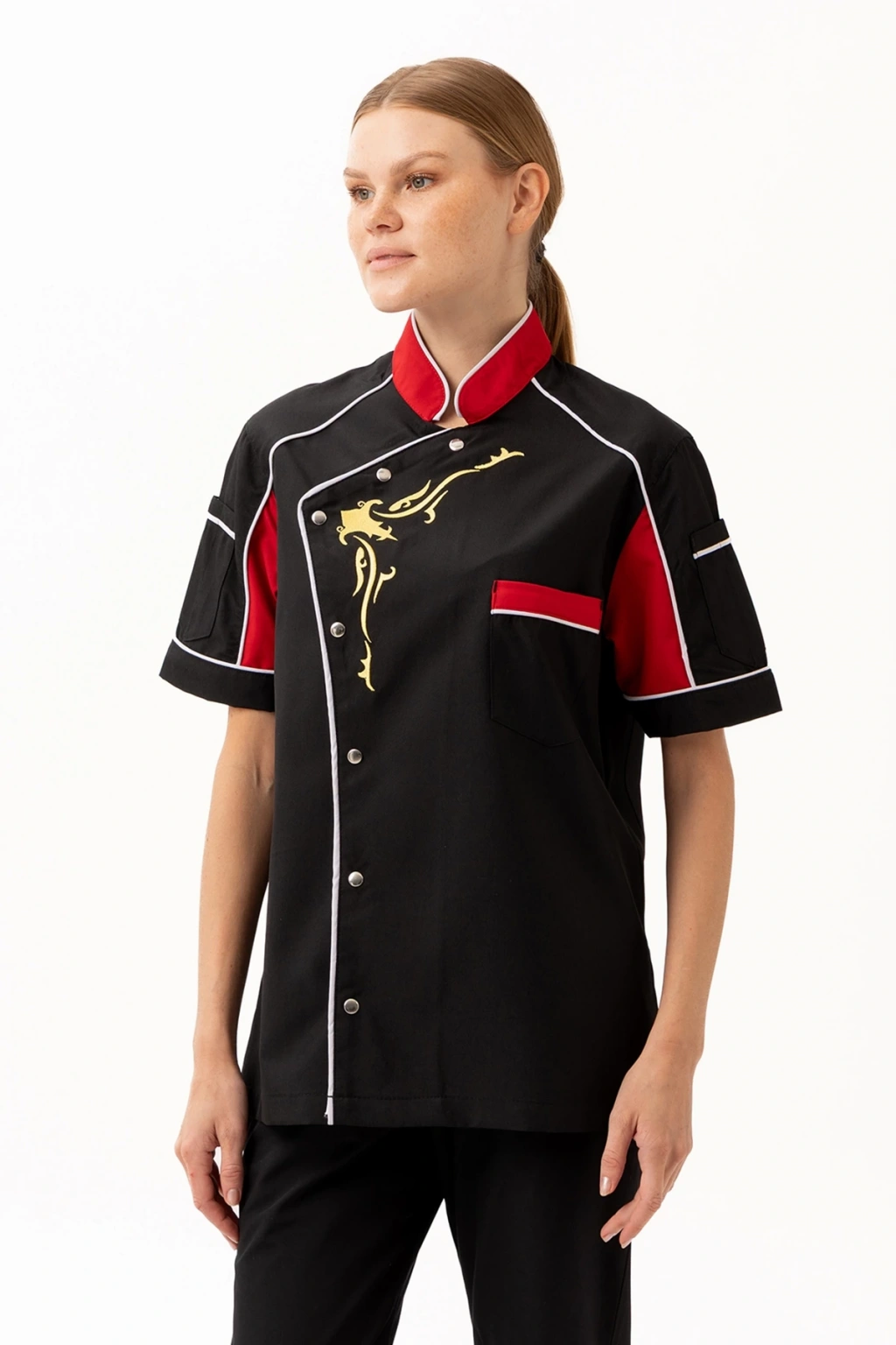 Evereste Aşcı Ceketi - UKE015-203.022.ALPAKA185 Evereste Aşçı Ceketi, güçlü duruşu, dikkat çekici renk geçişleri ve dinamik tasarımıyla profesyonel mutfaklarda fark yaratmak isteyen şefler için tasarlandı. Kısa kollu formu sayesinde serinlik ve hareket özgürlüğü sağlarken, altın sarısı desen detayı ile mutfaktaki ustalığınızı stilinize taşır. Ürün Avantajları: