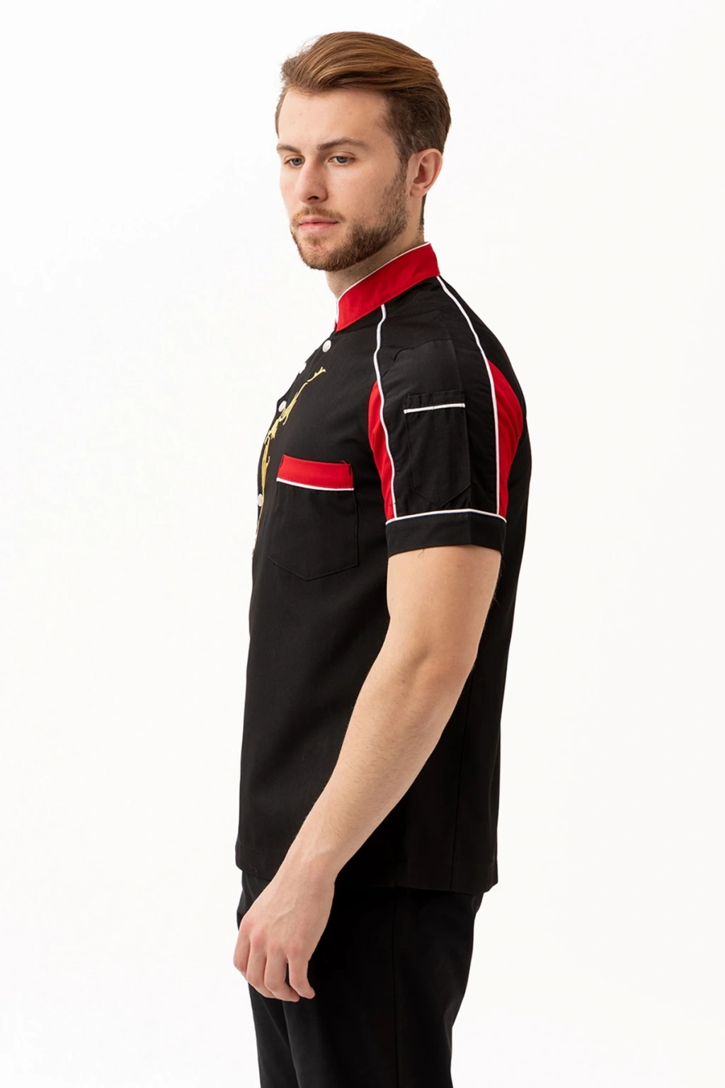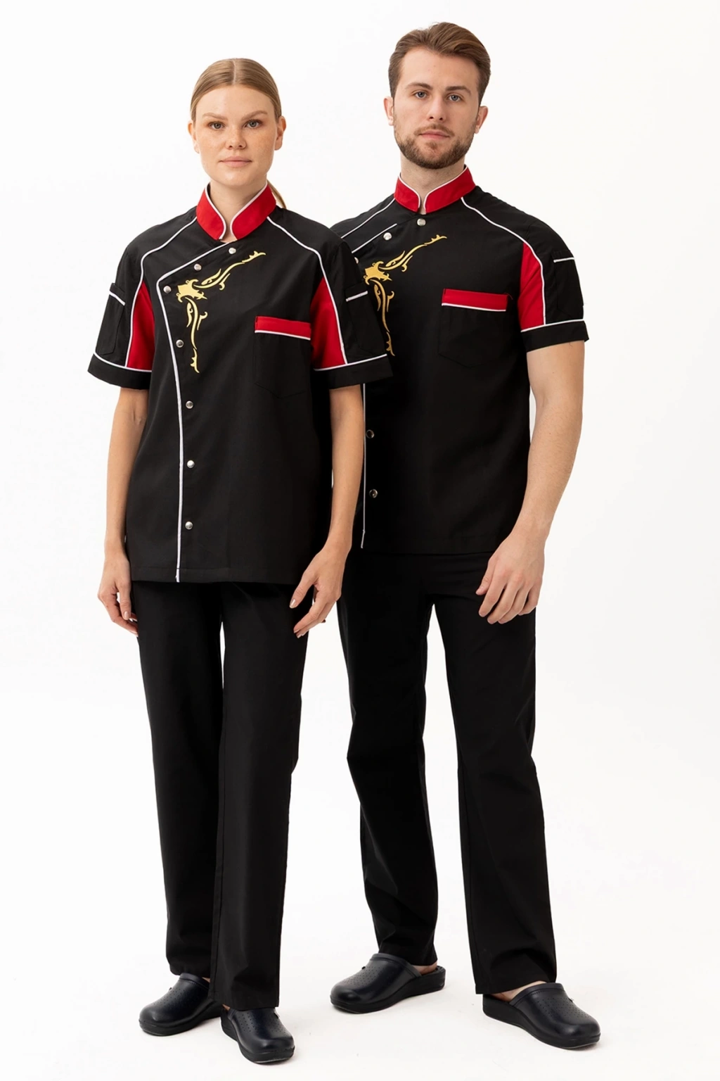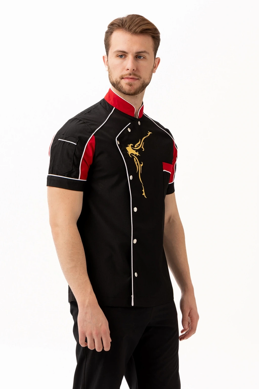 Evereste Aşcı Ceketi - UKE015-203.022.ALPAKA185 Evereste Aşçı Ceketi, güçlü duruşu, dikkat çekici renk geçişleri ve dinamik tasarımıyla profesyonel mutfaklarda fark yaratmak isteyen şefler için tasarlandı. Kısa kollu formu sayesinde serinlik ve hareket özgürlüğü sağlarken, altın sarısı desen detayı ile mutfaktaki ustalığınızı stilinize taşır. Ürün Avantajları: