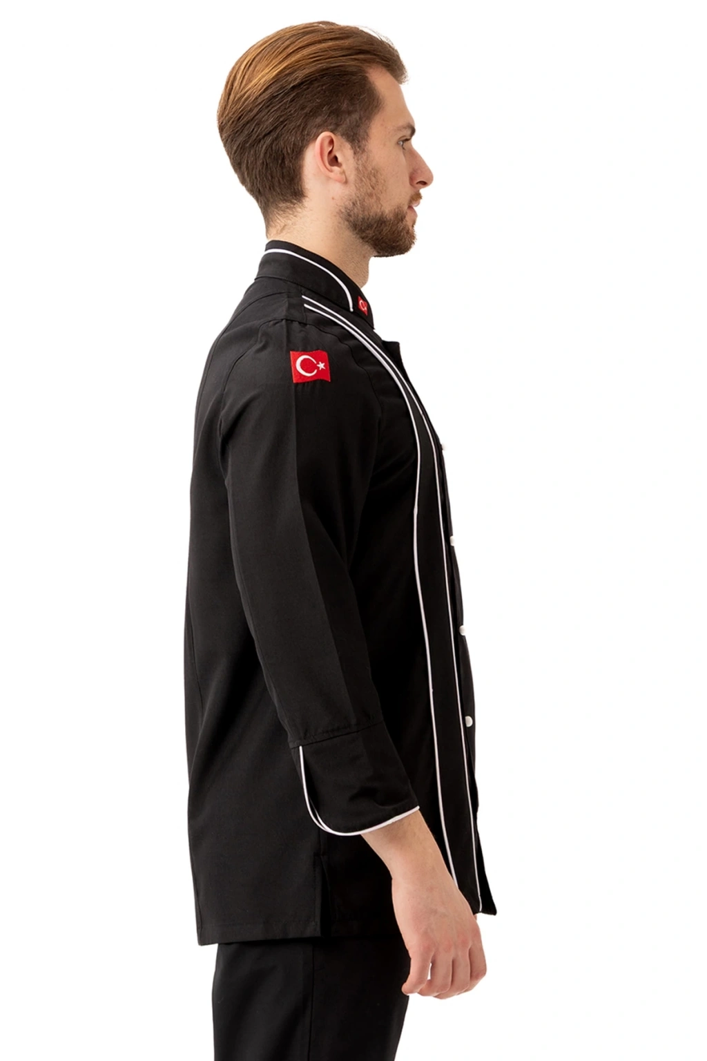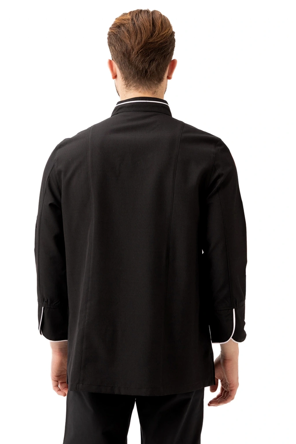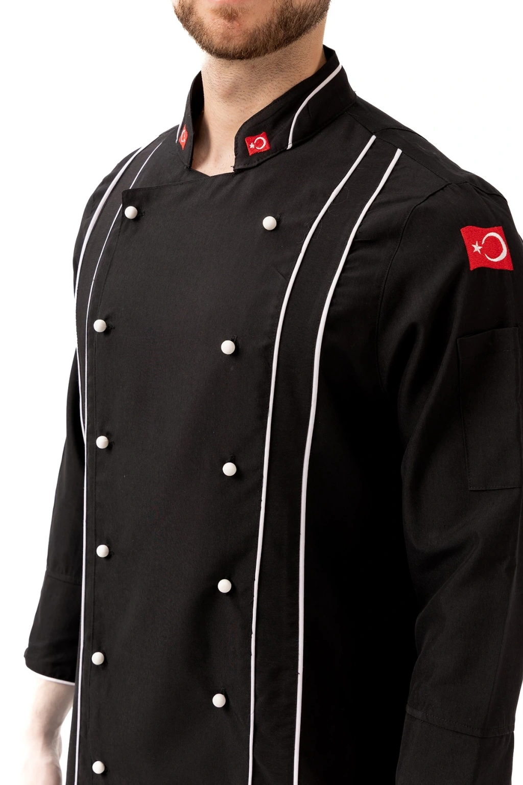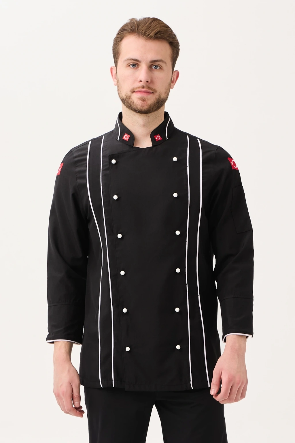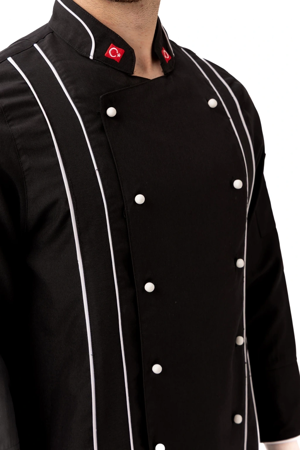 Hispanica Aşcı Ceketi - UKE015-403.019.ALPAKA185 Hispanica Aşçı Ceketi, geleneksel aşçı duruşunu modern detaylarla buluşturan şık ve prestijli bir modeldir. Tamamen siyah zemin üzerine dikey beyaz biyeler ve kruvaze düğme tasarımıyla öne çıkan bu ceket; zarif olduğu kadar işlevseldir. Ürün Avantajları: